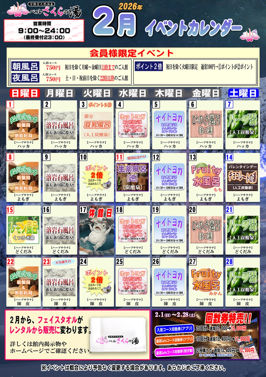 ※上記の時間に会員カード提示で受付すると『入浴コース』が750円